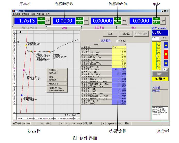 主要適用於對金屬、非金屬及複合材料的拉伸、壓縮、彎曲、剪切等力學性能的測試,可實現應力、應變、速度等組合命令控製。配合高溫爐使用可進行常溫~600℃的高溫試驗,根據GB、JIS、ASTM、DIN等標準自動求取最大試驗力值、抗拉強度、屈服強度、上下屈服點、抗壓強度、彈性模量等參數,自動生成試驗報告格式,並可隨時打印試驗報告曲線。