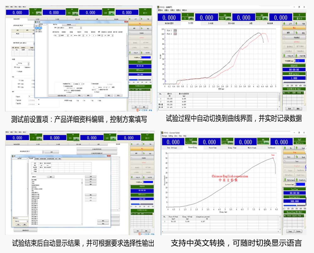 2、本測控軟件實時記錄,並動態顯示:力-時間、變形-時間、位移-時間、力-變形、力-位移、應力-應變等試驗曲線,支持多圖顯示,並可隨時切換查看;