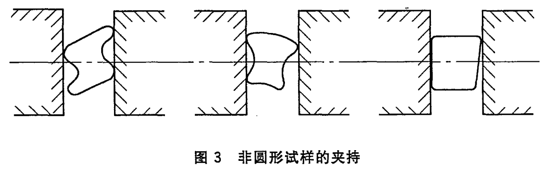 非圓形試樣的夾持,應使其較大尺寸平行於或近似平行於夾持麵,如上圖所示。如仍然無法按上圖夾持試樣,可自行設計特殊的、與異型線材試樣相匹配的異型夾具。