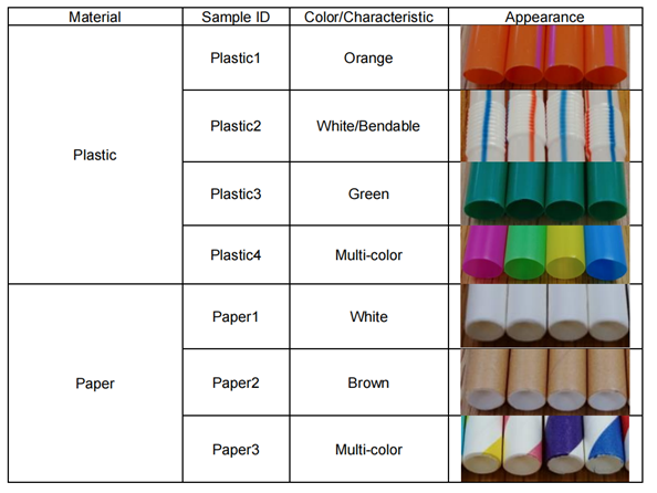 選擇紙質與塑料吸管,不同規格的習慣進行分別測試。