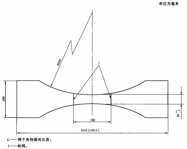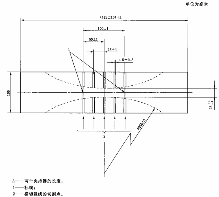 在試樣上與試樣縱向中心線垂直,與試樣中心等距地劃兩條標線,標距為100mm(見圖1、圖2、圖3和圖4)。