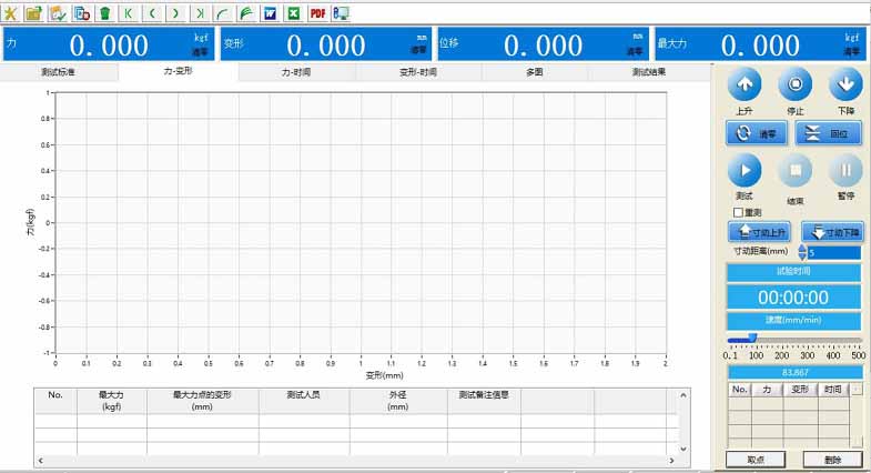 (2).曲線顯示界麵:用來顯示測試得到的各種曲線,比如力-變形,力-時間,變形-時間等各種曲線,也可對曲線做放大縮小等操作,力量-位移等曲線顯示:
