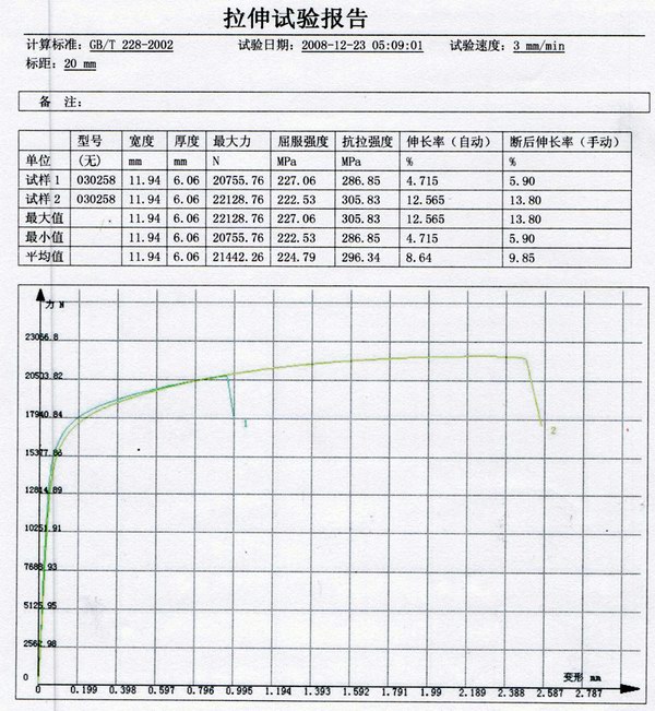 金屬材料室溫拉伸試驗報告:最大力、屈服強度、抗拉強度、伸長率、斷後伸長率;