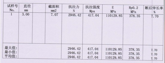 ①截麵積 ② 抗拉力 ③抗拉強度 ④ E ⑤Rp0.2 ⑥斷後伸長率