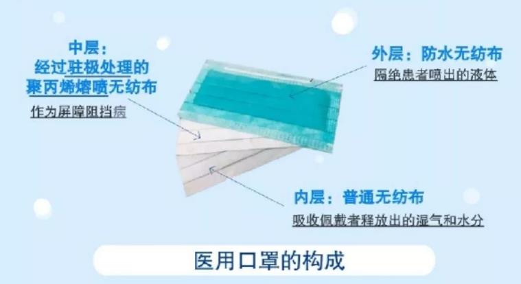 常見的醫用口罩,主要由三層無紡布組成。內層是普通無紡布,主要用於吸收佩戴者釋放出的濕氣和水分;外層是做了防水處理的無紡布,主要用於隔絕患者噴出的液體;核心中間的過濾層用的是經過駐極處理的聚丙烯熔噴無紡布,作為屏障阻擋病菌。