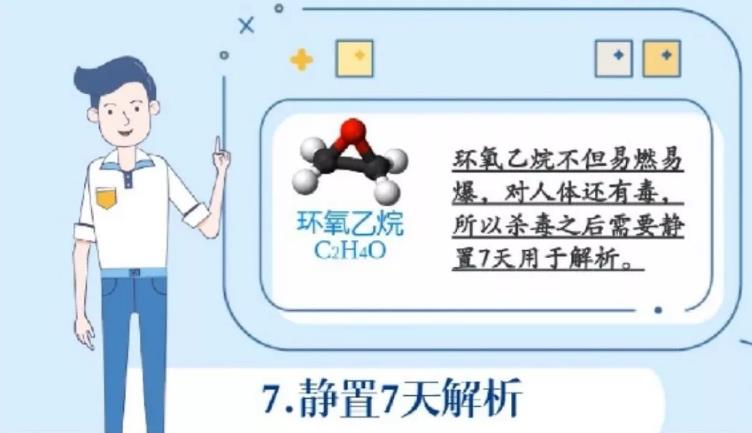 環氧乙烷易燃易爆,對人體有毒,因此殺毒後需要靜置7天用於解析,殘留量低於要求值,才能包裝出廠,供給醫護人員使用。