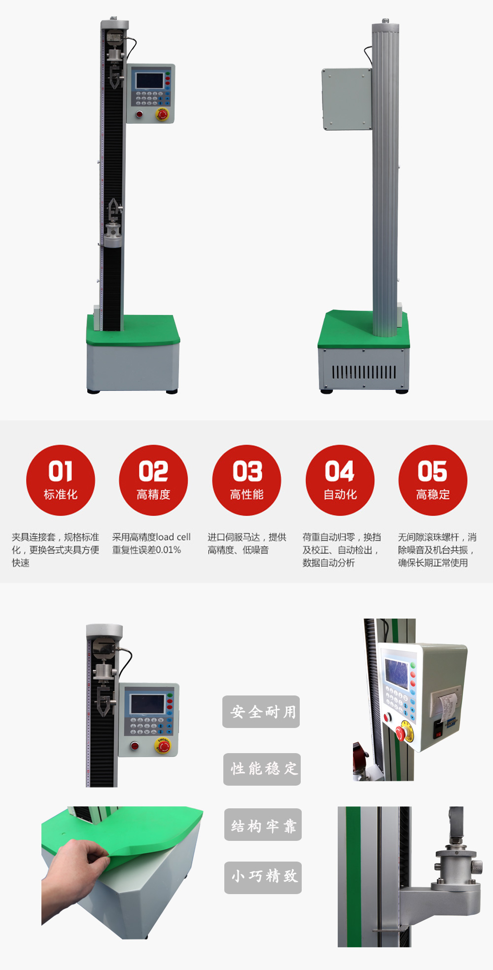 可自動求取拉伸強度、最大力、拉伸彈性模量等試驗參數,並可根據 GB、ISO、DIN、ASTM、JIS 等國際標準進行試驗和提供數據。
