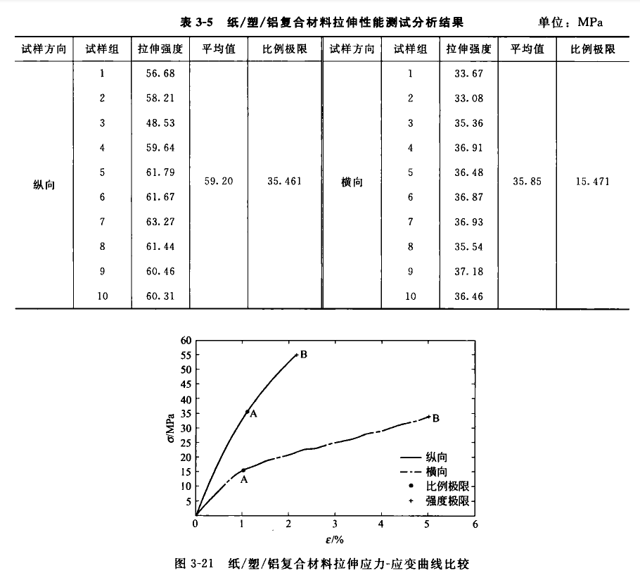 例如,表中、下圖中提供了飲品(如牛奶、飲料)利樂包裝用紙/塑/鋁複合包裝材料的沿縱向、橫向的拉伸特性及其曲線,拉伸速度100mm/min,在試樣兩端緩慢地施加單向載荷,直到試樣斷裂為止。
